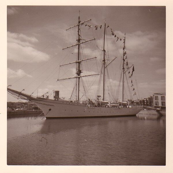 Formaat : 8 x 8 cm. + negatieven. 18 Foto's van het zeil- en schoolschip "Mercator". Hier gemeerd in het tweede handelsdok.