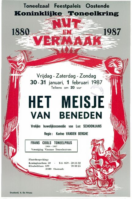 Affiche : Koninklijke toneelkring Nut en Vermaak Oostende. Het meisje van beneden. Feestpaleis Oostende. 30-31/01 en 1/02/1987