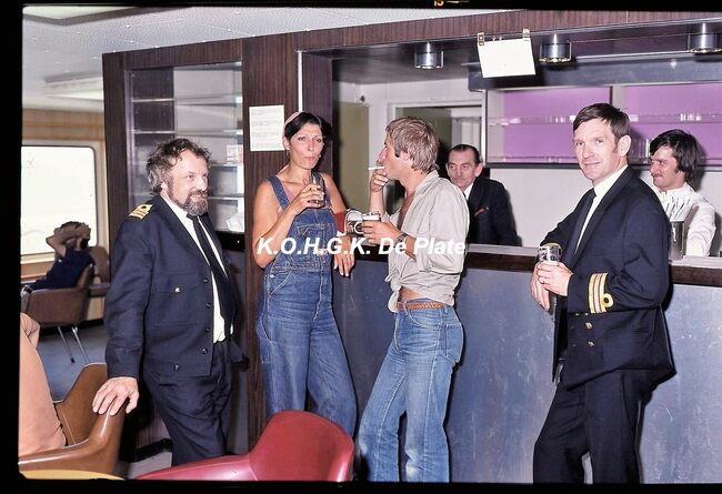 Afdruk, formaat : 29.5 x 21 cm. De solariumbar van de carferry "Princesse Marie-Christine" .Voor de bar : links, tweede officier werktuigkundige, Robert Severy en rechts, eerste officier werktuigkundige, Lucien …