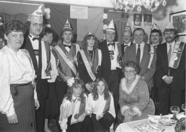 Verkiezing Albrecht en Isabella in 1990. Naast de aartshertogin Isabella, Norbert Van der Cruyssen met naast hem Dries Vermeesch. Rechts, gehurkt, Meetje van Mariakerke, Hilda Seys