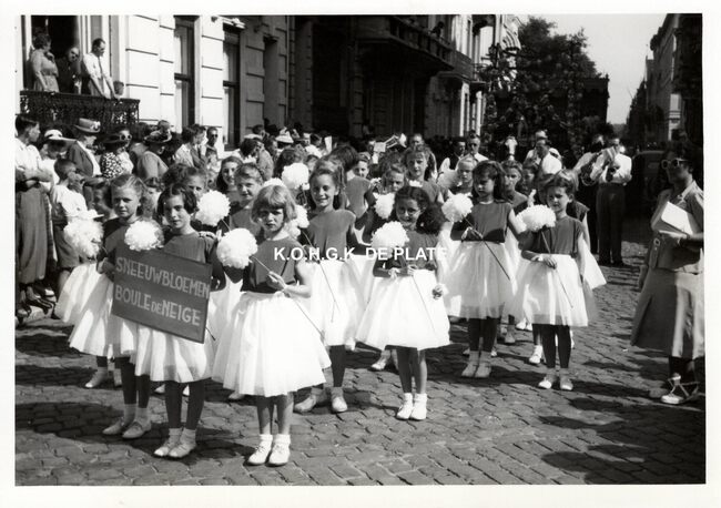 Formaat : 12 x 17 cm. - Een groep meisjes in de Sint-Peterburgstraat, nu Léon Spilliaertstraat. Zij dragen een bord met het opschrift : Sneeuwbloemen. Boule de Neige.