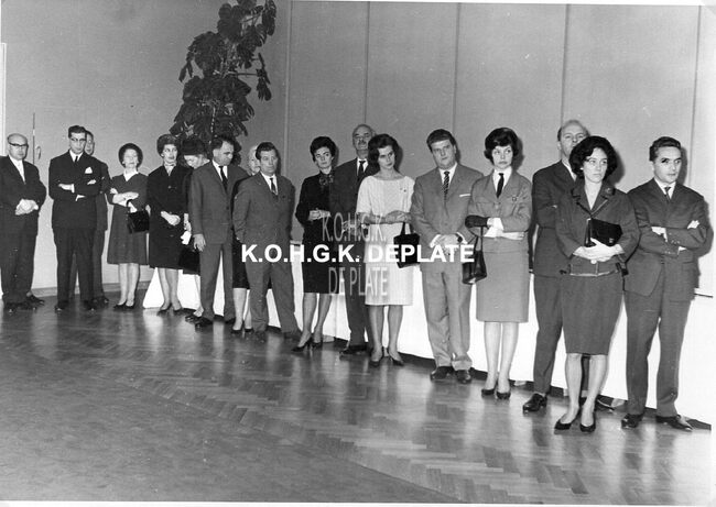 Formaat : 13 x 18 cm. - Plechtige ontvangst door het Stadsbestuur met in het midden burgemeester Jan Piers en zijn echtgenote, zittend. Naast de burgemeester links, schepen Roger De Kinder.