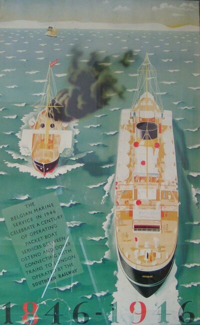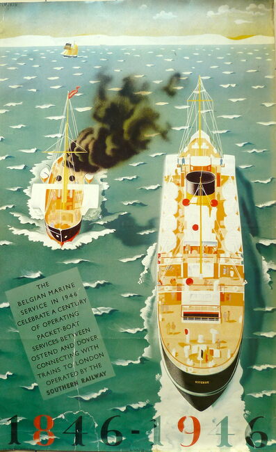 Formaat : 94 x 58 cm. - Reproductie. - of operating packet-boat services between Ostend and Dover connecting with trains to London operated by the Southern Railway. - Getekend linksboven : Severin