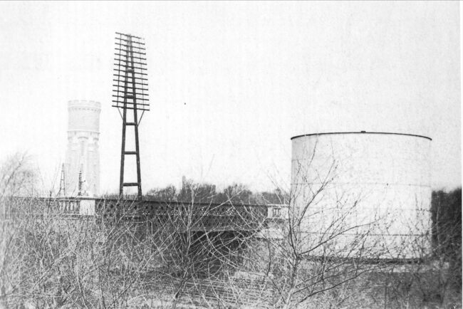Foto : De vaste ijzeren brug over de spoorlijn Oostende-Brussel (1910). Links de watertoren en rechts watertank voor de stoomtreinen
