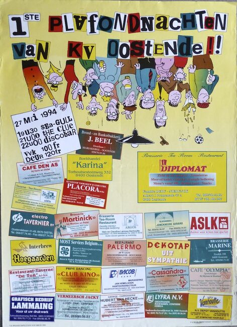 Foto van een groep supporters van de maatschappij "De Buffalo's" (supportersclub van ASO genomen voor het café op de hoek van de Stuiverstraat en de Torhoutsesteenweg (met o.a René Menu en Alfons Laridon en…