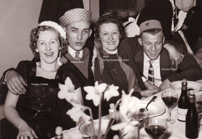 Foto z/w 18 x 13. Biljartclub sporting viert feest maart 1957. V.L.N.R. Derijker Clotilde - Sabbe René - Marie ? (echtg Rodenbach Albert) - Devaux Roger