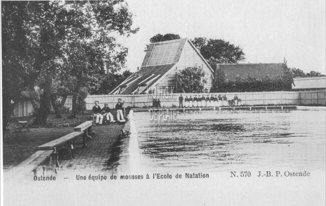 Zwart/wit foto Antony 150934. Formaat : 10,5 x 15 cm. – Het eerste stedelijk zwembad en zwemschool werd opgericht tussen 1894-1895 en was gelegen nabij de watertoren aan de Gistelsesteenweg (nu Mercatorlaan) en vlakbij…