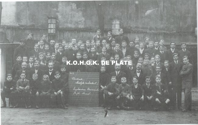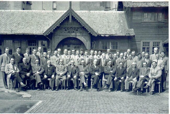 Formaat : 20 x 30 cm. - Het lerarenkorps in 1952. Zittend v.l.n.r.: Vermeersch, Ladon, Buys, De Backer, De Buf, Devisscher, Directeur ir. L.J. Tanghe, Lemmens, Vandeberghe, Frankignoul, Mullier, Bastin, Hofman.…
