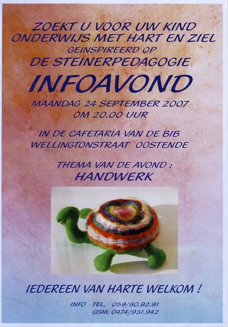 Affiche : De Steinerpedagogie. Infoavond. Handwerk. Cafetaria van de Bib. 24/09/2007.