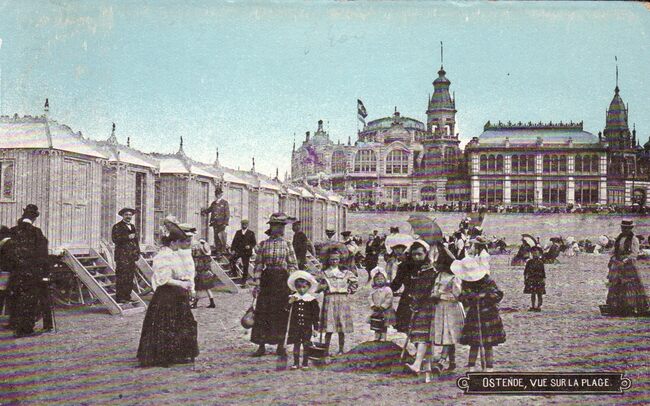 Ostende, les cabines de bain. - Op de achtergrond, de westgevel van het derde Kursaal. Links enkele luxe-badkarren en spelende kinderen op het Groot Strand