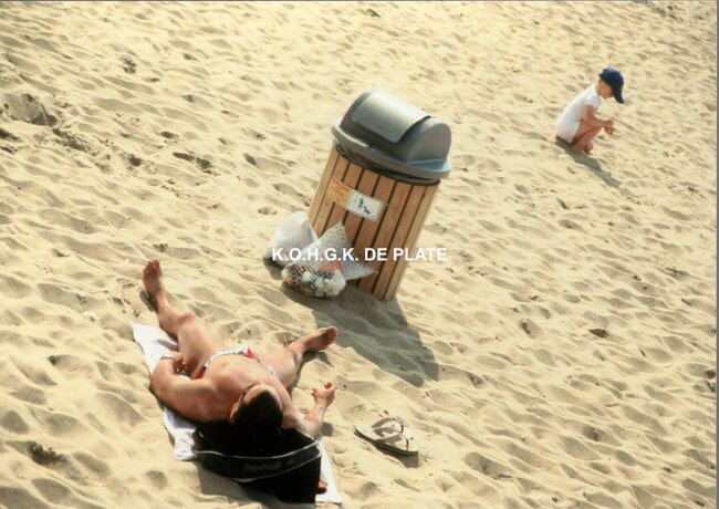 Formaat : 12,5 x 18 cm. - Zonnebaden op het strand naast een afvalbak. Rechts een spelend kind