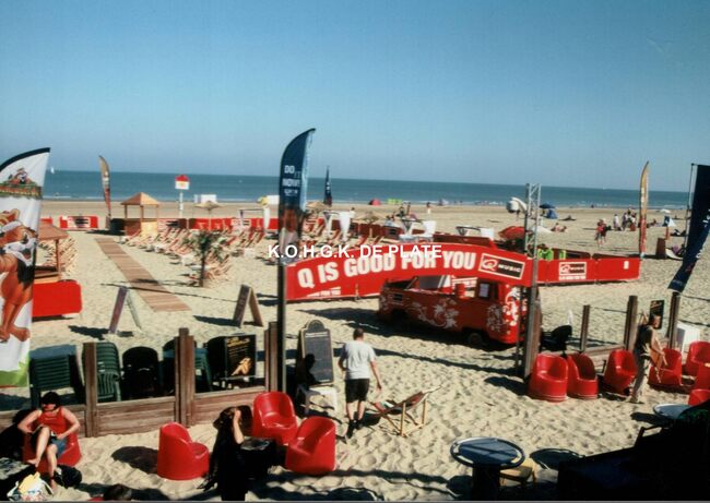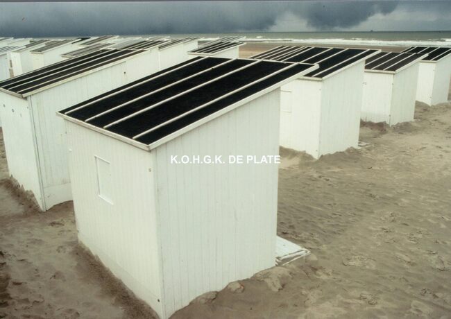 Formaat : 13 x 18 cm. - Zonnepanelen op de kabines van Q Beach House waar radiostation Q-Music gevestigd is gedurende juli en augustus
