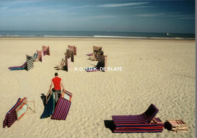 Formaat : 13 x 18 cm. - Klaarzetten van strandzeilen en -zetels aan het begin van de dag op het Groot Strand