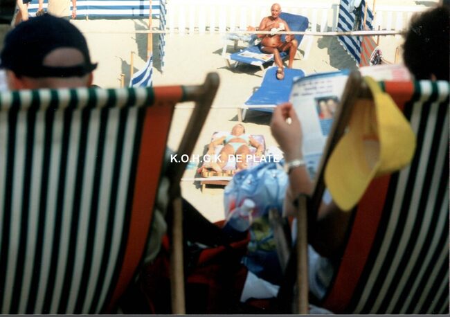 Vergroting. - Formaat : 29,5 x 40 cm. - Genieten van de zon op het Klein Strand. Rechts het Weststaketsel
