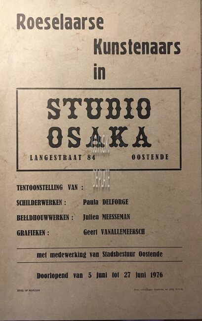Affiche : Paula Delforge, Julien Meesseman en Geert Vanallemeersch. Tentoonstelling. Studio osaka. Van 5 tot 27 juni 1976