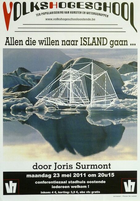 Affiche : Volkshogeschool. Allen die willen naar Island gaan.. Conferentiezaal stadhuis Oostende. Maandag 23 mei 2011.