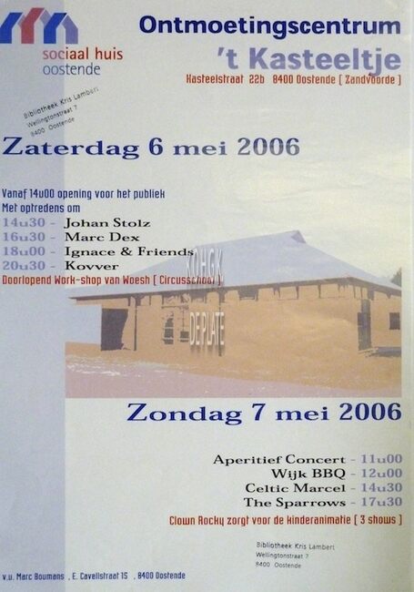 Affiche : Sociaal Huis Oostende. Optredens en workshops. OC 't Kasteeltje. 6-7/05/2006