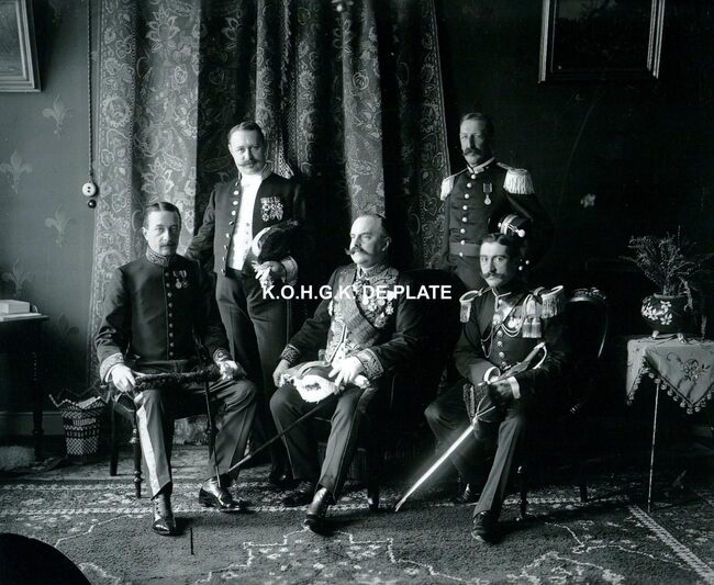 Formaat : 10 x 25 cm. - Christian Thams, tweede van links, bij de kroning van de Noorse koning Haakon VII op 22 juni 1906