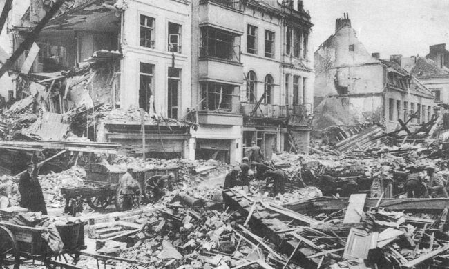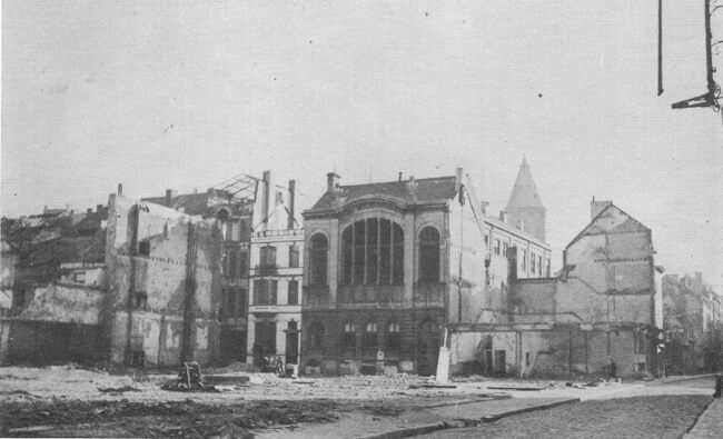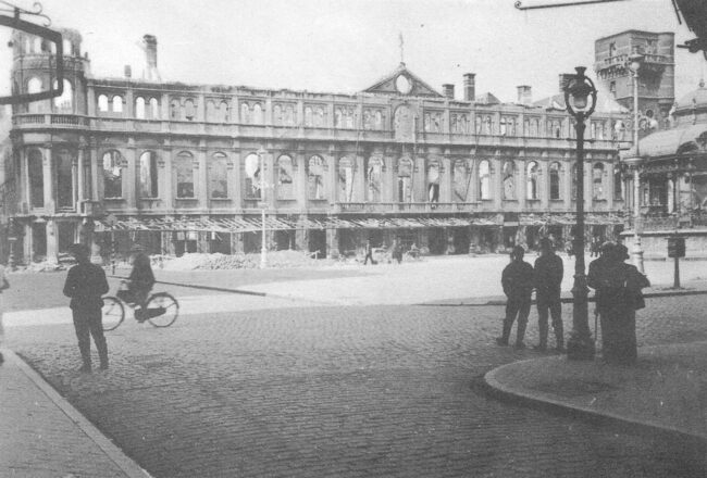 Nels. C7. Oostende 1940. Wapenplaats. - We zien de vernielingen tussen de Brabantstraat (links) en de Breidelstraat (rechts) door de bombardementen van mei 1940. Beneden rechts, een gedeelte van de muziekkiosk.
