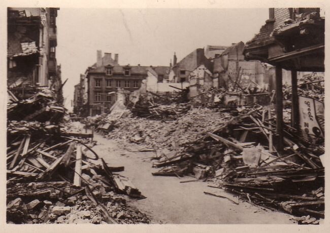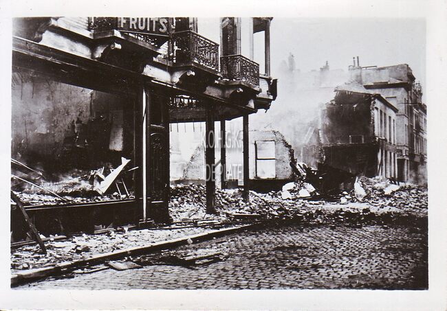 Foto : 9 x 6 cm. Ruïnes hoek Kapelle- en Ooststraat met zicht op de Albertschool. De jongensschool opent haar deuren in 1910, maar ontsnapt ook niet aan het oorlogsgeweld. De stedelijke werkhuizen en de firma F. Fontaine…