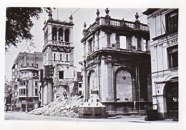 Foto : 9.5 x 6.5 cm. - Vernielde woningen op de Vindictivelaan. Nog herkenbaar "Hotel Pullman" en rechts "Hotel Atlantic". Links de torens van de Sint Petrus en Pauluskerk