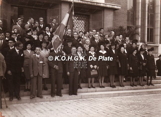 Formaat : 18 x 13 cm. - Inhuldiging herdenkingsplaat Potitiekorps Oostende "Aan zijn overleden of vermiste helden". Deze plaat hangt sedert mei 1971 in de grote hall van het stadhuis. Ontworpen door de Gentse…