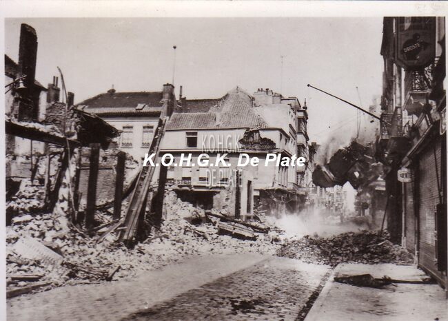 Foto : 9 x 6,5 cm. - Vernielde woningen in de Kapellestraat. Op de linkerhoek met de Ooststraat, Radio De Meester