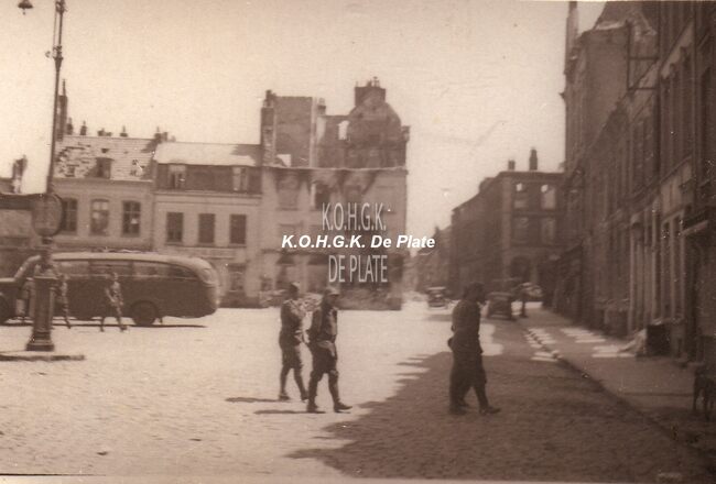 Foto : 9 x 6 cm. - Links de toren van het verwoeste stadhuis, waarvan de gevel reeds werd afgebroken. Op de achtergrond een gedeelte van de Kapellestraat