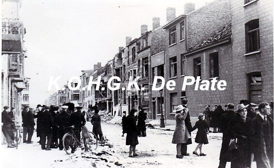 Foto : 9,5 x 6.5 cm. - Het Wapenplein na de bombardementen van mei 1940. Gedeelte tussen de Brabant- en Breydelstraat. Rechts de Kerkstraat. Foto : (kopie van postkaart). Het Wapenplein in het Interbellum. (met dank aan…