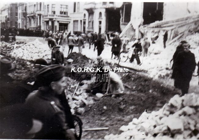 Foto : 9.5 x 6.5 cm. - Het Wapenplein na de verwoestende bombardementen van mei 1940. De puinen van het Stadhuis worden gesloopt.