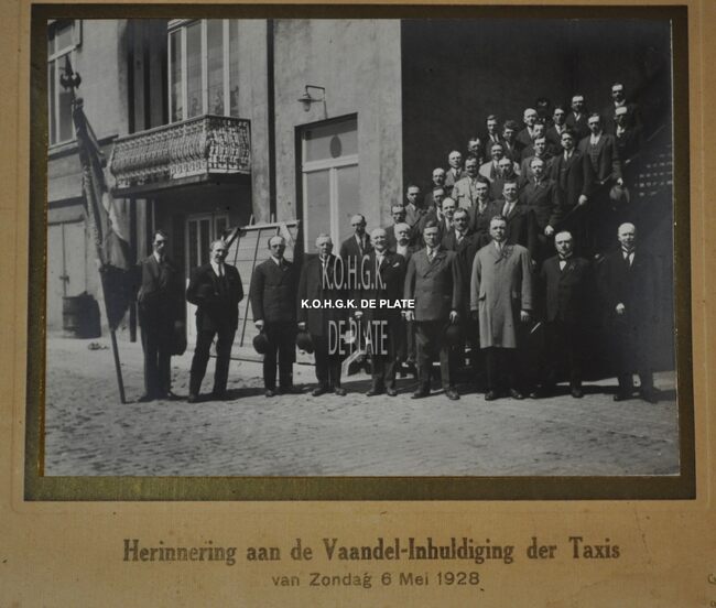 Herinnering aan de inhuldiging van het Vaandel der Taximannen op 6 mei 1928 Op de voorgrond van links naar rechts het bestuur : Julien De Ketelaere, Louis Panesi, Emiel Wybouw, Emiel Vanmol, ere-voorzitter…