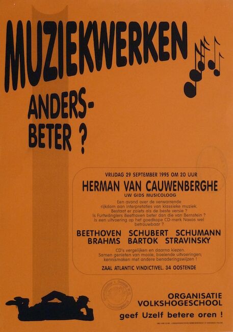 Affiche : Volkshogeschool. Muziekwerken, anders- beter?. Zaal Antlantic. 29/09/1995