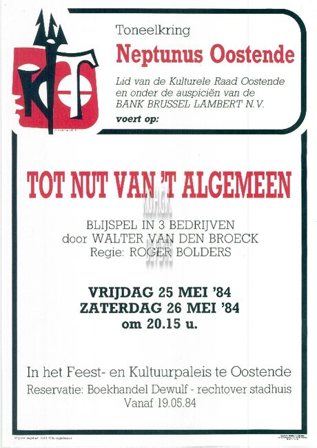 DE BACCHANTEN (TONEELVERENIGING)TONEELSTUKKENAFFICHESFEEST- EN CULTUURPALEIS ; TONEELTOT NUT VAN 'T ALGEMEEN (TONEELSTUK)VAN DEN BROECK WALTER (AUTEUR)BALFOORT PIET (1933-2013) (ACTEUR TONEELREGISSEUR)LALEMAN NOËL (TONEELSPELER TONEELREGISSEUR)DEPREZ CECILE (TONEELSPEELSTER)SERCU HUGO (TONEELSPELER)BLANCKAERT LILIANE (TONEELSPEELSTER)VANDEWALLE KATHLEEN (TONEELSPEELSTER)