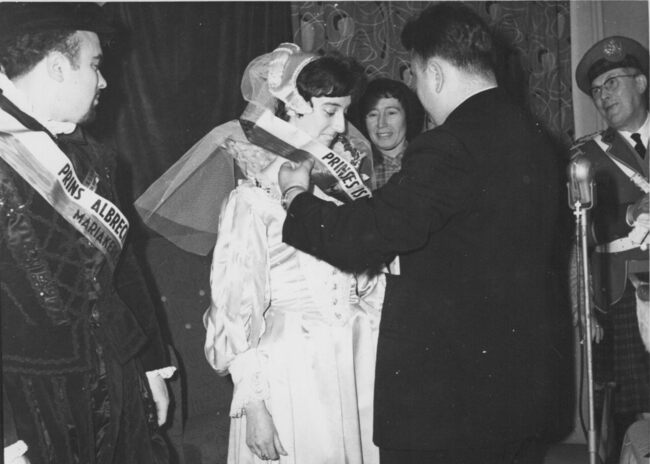 Negatief : 6 x 5,5 cm. - Het prinsenpaar Albrecht en Isabella van Mariakerke 1965. Links, rechtstaand, Norbert Van der Cruyssen, van de "Orde der Sombrero's". Hier in Hotel du Kursaal te Mariakerke.