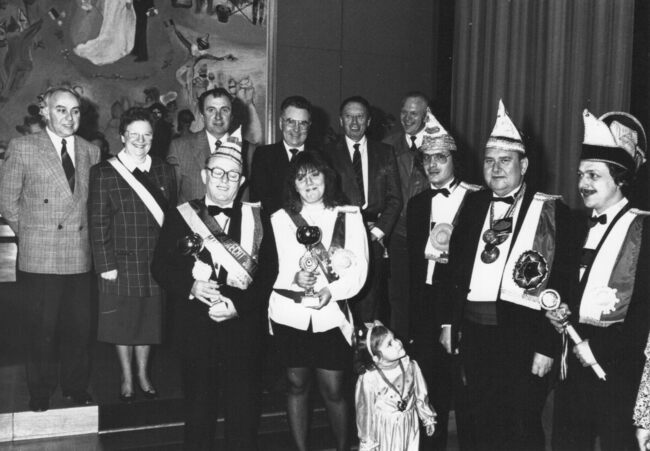 Negatief : 6 x 9 cm. - Burgemeester Jan Piers, in het midden aan tafel, met carnavalist Norbert Van der Cruyssen (links) en schepen Kamiel Dehouck (rechts). De folkloregroep de Oude Ijslandvaarders met vlag trad ook op…