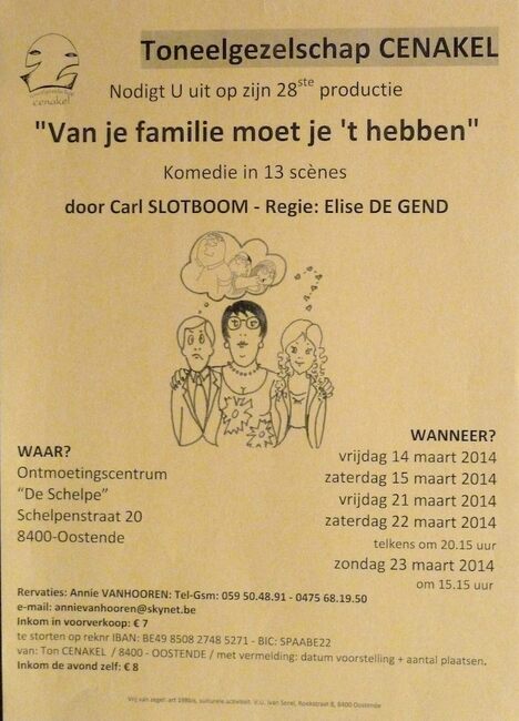 Affiche : Toneelgezelschap Cenakel. Van je familie moet je 't hebben. OC De Schelpe. 14-15-21-22-23/03/2014