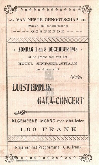 op zondag 19 mei 1918 (Pinksteren) in hotel St.-Sebastiaan ten voordele van de behoeftige Oostendse krijgsgevangenen in Duitsland