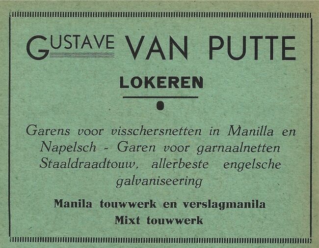 Advertentie : Gustave Van Putte, Lokeren. - Garens voor visschersnetten in Manilla en Napelsch, garen voor garnaalnetten, staaldraadtouw, allerbeste engelsche galvaniseering, Manila touwwerk en verslagmanila, mixt touwwerk