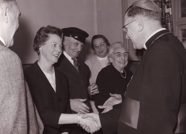 Formaat : 13 x 18 cm. - De bisschop van Brugge wordt ontvangen door de directrice, mevrouw Marie-Louise Va,de,berghe van het Godtschalk Insituut voor oude zeelieden aan de Dokter Eduard Moreauxlaan.