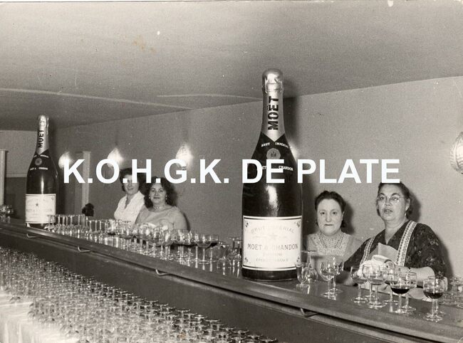 Formaat : 13 x 18 cm. - Het personeel van de bar. En maar glazen wassen... Madeleine Vens (rechts), met naast haar Irma Westerlinck en twee onbekende dames. Moet er nog Moët & Chandon zijn !.
