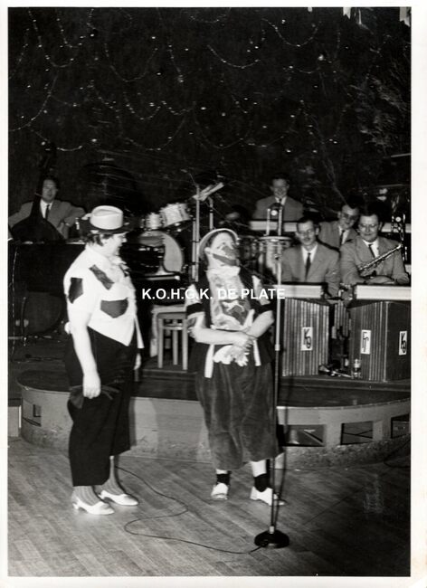 Formaat : 13 x 18 cm. - Irma Westerlinck en Madeleine Vens in een sketch. Op de achtergrond, het kursaalorkest van Franz Lebrun. Links, leunend op de piano, onze stadsgenoot Roger Vanhaverbeke. Hij speelde contrabas in…