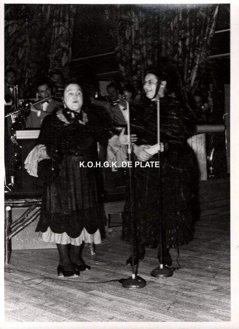 Formaat : 18 x 13 cm. - Irma Westerlinck en Madeleine Vens in een sketch. Op de achtergrond, het kursaalorkest van Franz Lebrun.