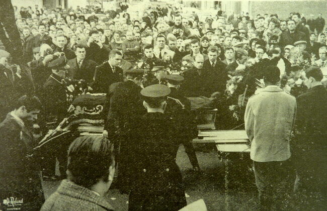 Foto : Laurent Verbiest werd begraven in de Sint Antoniuskerk (Vuurtorenwijk). Links onder met gebogen hoofd, zijn ploegmakker Wilfried Puis. (Photo Roland)