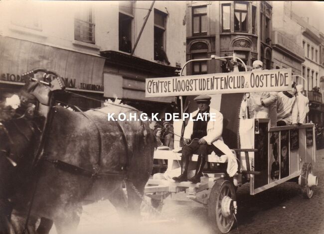 Formaat : 13 x 18 cm. - Praalwagen nr.39 "De Reizende Operatietafel" getrokken door twee paarden van de "Gentse Hoogstudentenclub Oostende" in de Adolf Buylstraat