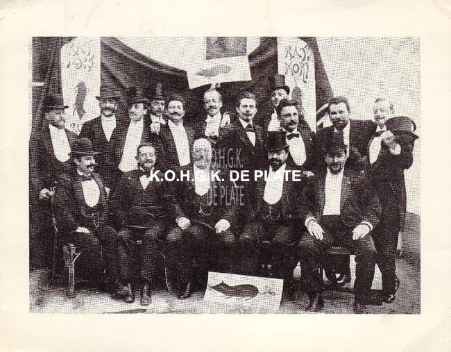 Formaat : 18 x 14 cm. - De stichters van de "Confrérie du Rat Mort" : (1) Deridder Fréderic - (2) Seeuwen Henri - (3) Ditte Albert - (4) Brouwet Léon - (5) Van Craeynest Daniel - (6) Pede August - (7)…