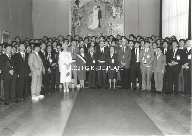 Formaat : 13 x 18 cm. - . Esperantogroep "La Konko" ontvangen op het stadhuis door burgemeester Goekint en enkele leden van het Schepencollege. De dame in wit naast schepen Paul Van Laere is Flory Witdoeckt.…