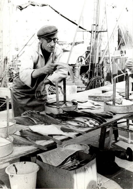Formaat : 18 x 13 cm. - Verkoop van verse vis op de Visserskaai door een visser. Let erop, de visser verkoopt ook vis in een zeef. Hij verkoopt de vis in een zichte, dit wil ook duiden dat het juiste gewicht niet bepaald…