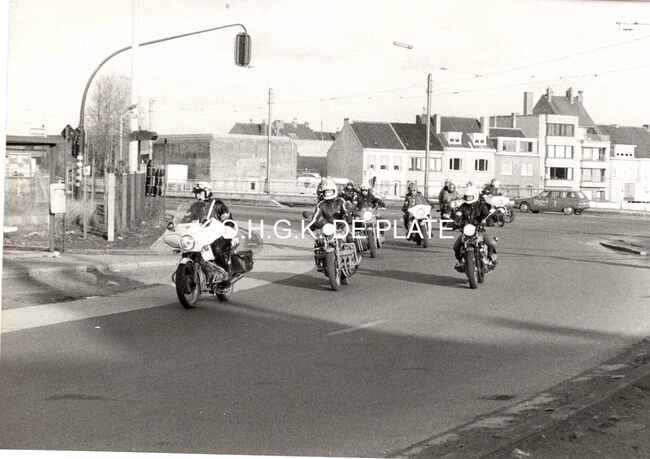 Formaat : 12 x 17 cm. - Enkele motorrijders op de Slijkensesteenweg richting centrum. In de achtergrond rechts de Bredenesesteenweg met de betonnen transformatorbunker . Links de brug richting Bredene