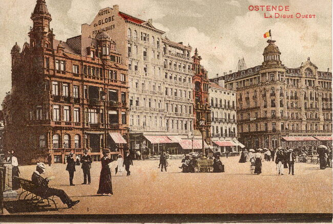 Edit. F. Maasen, Brux. Ostende - La Digue Ouest. - Gekleurde prentkaart. - De Zeedijk, tussen Kursaal-Westhelling en Ijzerstraat. Hôtel du Globe met links Villa Emma-William en rechts Hotel Wellington.