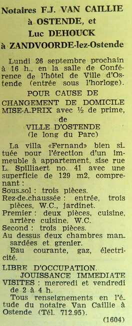 Advertentie : Etudes des notaires F.J. Van Caillie et Luc Dehouck. Vente publique. Villa Fernand. L. Spilliaertstraat 41